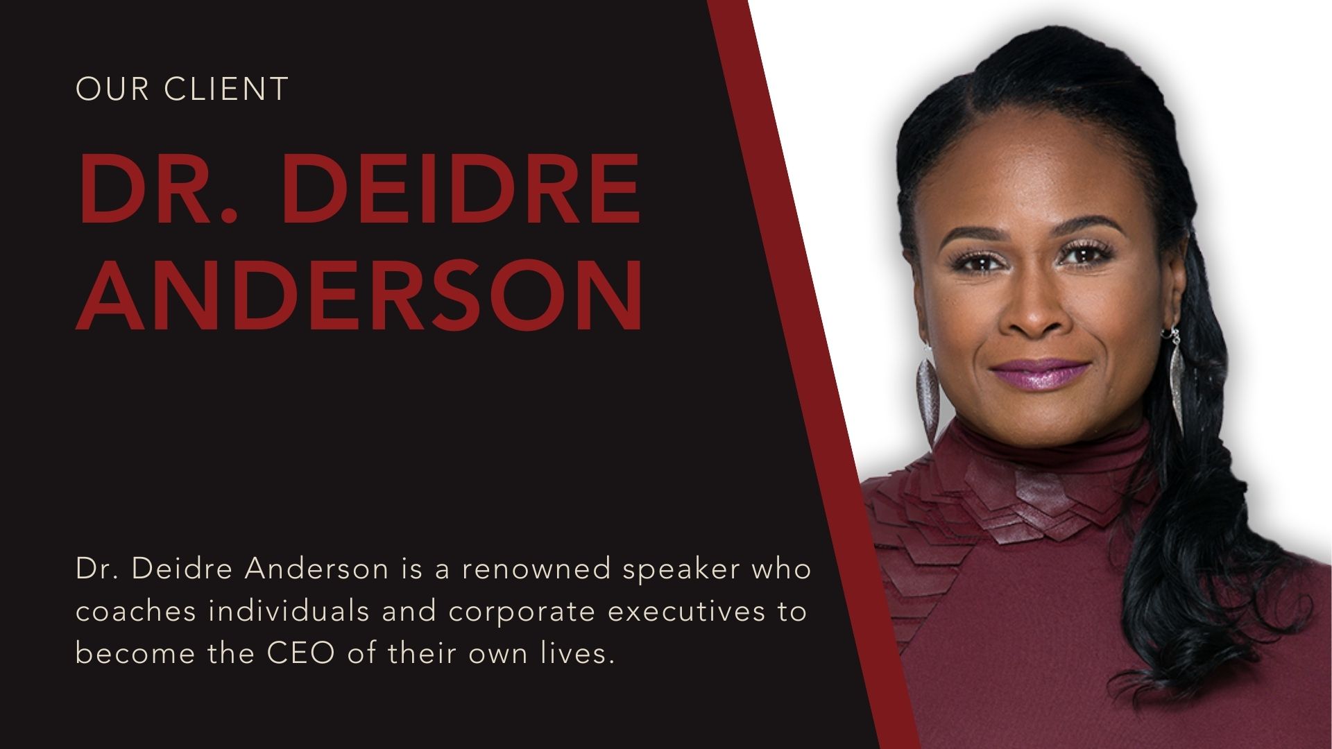 Dr. Deirde Anderson is a renowned speaker who coaches individuals and executives to be the CEO of their own lives.